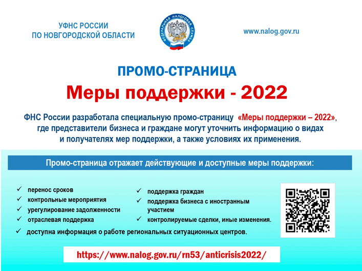 Управление ФНС России по Новгородской области обращает внимание, что актуальные меры поддержки юридических и физических лиц размещаются на официальном сайте ФНС России в разделе «Меры поддержки-2022».