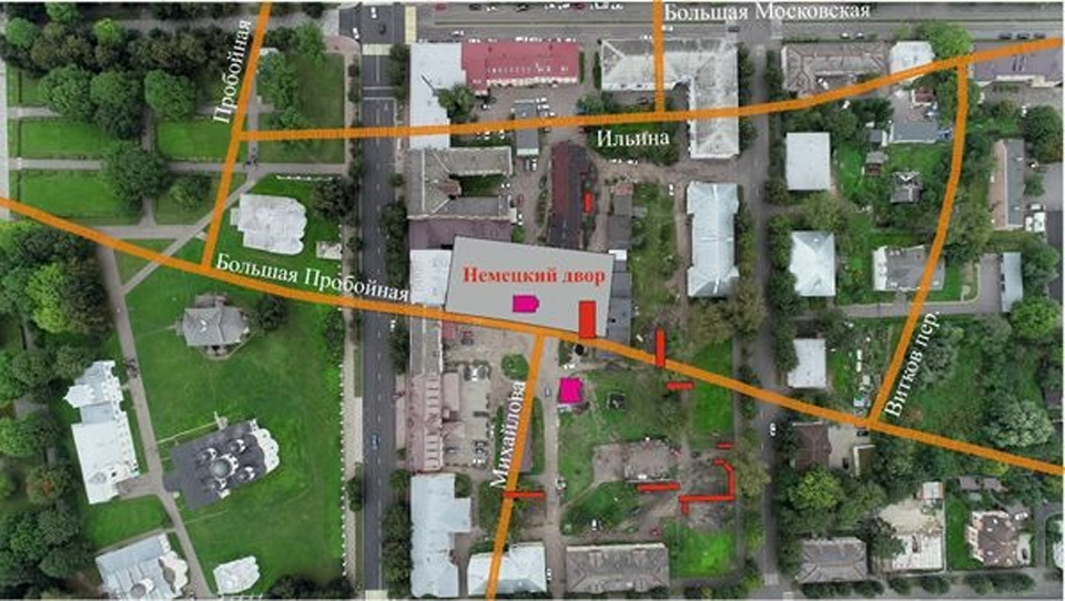 Точное местонахождение Немецкого двора при этом не было известно до раскопок 2020 года. В 2020 году археологи раскрыли фрагменты средневековых улиц Большая Пробойная и Михайлова и примерно определили, где располагалась фактория ганзейских купцов. Оказалось, что её южная граница проходила по улице Большая Пробойная, восточная — около церкви Иоанна Крестителя, западная — под современными домами и тротуаром на современной улице Большая Московская. В соседних шурфах археологи сделали находки, указывающие на близость Немецкого двора. Там были найдены: деревянная бирка со знаком ганзейского купца, ливонские монеты начала XV века, ходившие в Новгороде до начала чеканки собственных монет в 1420 году, фрагменты рейнской керамики, западноевропейские текстильные пломбы, черепица, ганзейская дубовая бочка высотой в один метр.