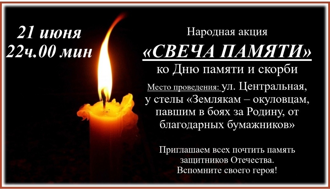 Для жителей и гостей города акция «Свеча памяти» пройдёт 21 июня 22:00 часов у стелы «Землякам – окуловцам, павшим в боях за Родину, от благодарных бумажников» по улице Центральная.