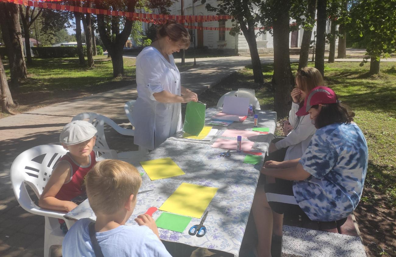 Сегодня, 30 июля, в Екатерининском сквере сотрудник Крестецкого краеведческого музея С.В. Ромасюк делилась с присутствующими секретами создания аппликации «Радужный павлин».