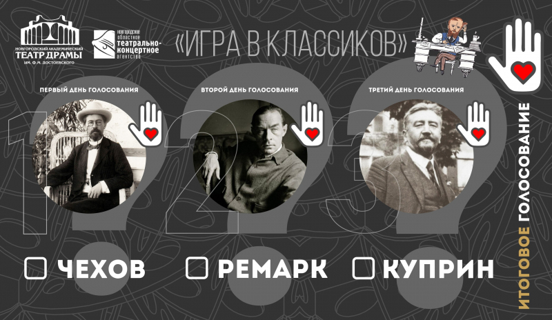 Писатели - Чехов, Ремарк, Куприн стали лидерами полуфиналов в зрительском голосовании. Автор, за которого сегодня проголосует большинство новгородцев выйдет в финал и его произведение будет поставлено на сцене театра в 2023 году.