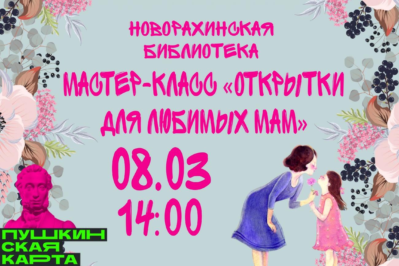 В Новорахинской библиотеке 8 марта в 14:00 будет проходить мастер-класс «Открытки для любимых мам», на котором участники смогут изготовить открытки для своих мамочек и бабушек в виде букета цветов, с использованием картона, цветной бумаги, бусинок, ленточек. Каждый участник проявит творческую фантазию и мастерство в оформлении своего подарка.