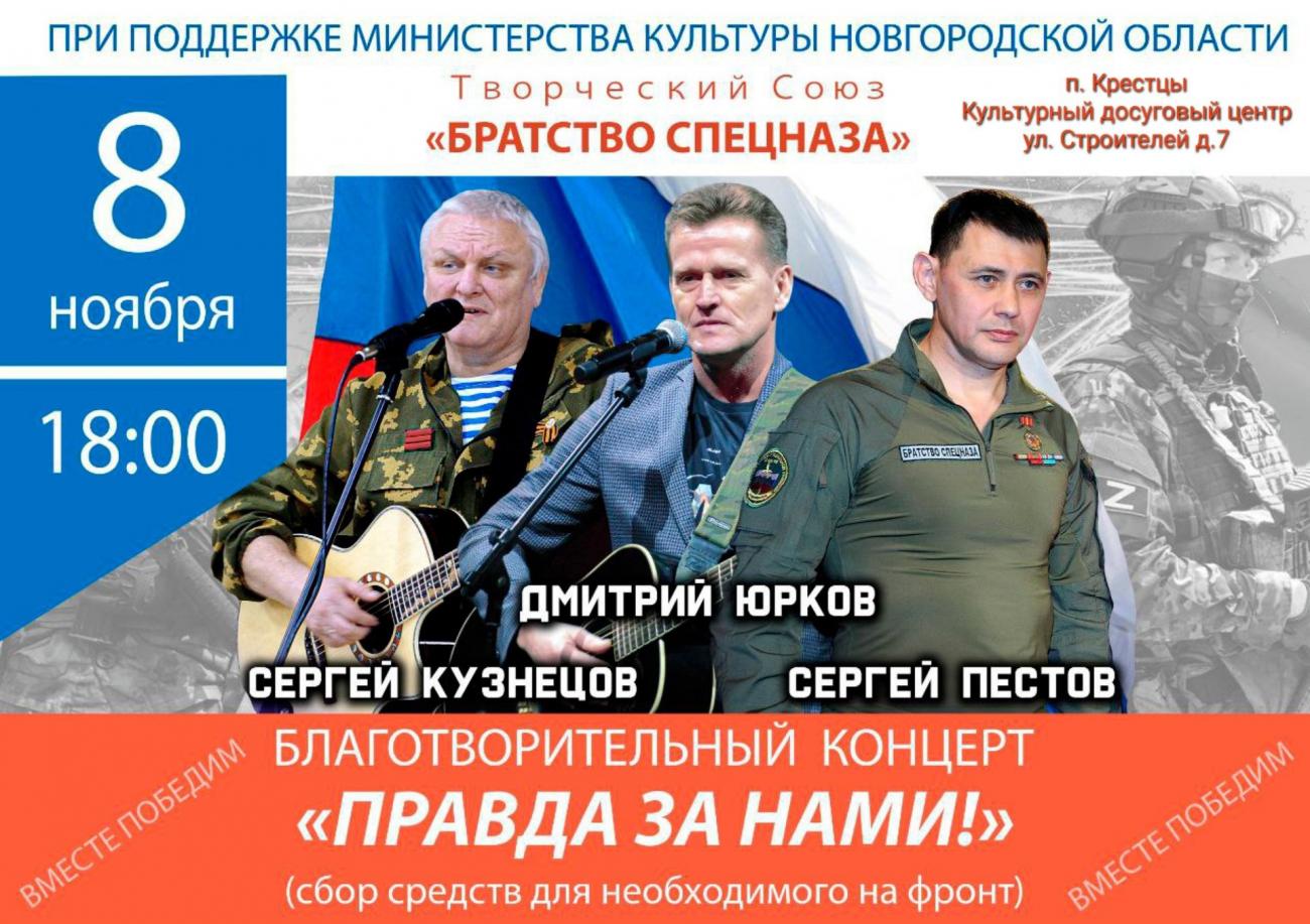 Творческий союз ветеранов подразделений специального назначения «Братство Спецназа» приглашает жителей и гостей поселка, семьи участников СВО на патриотический концерт «Правда - за нами!».