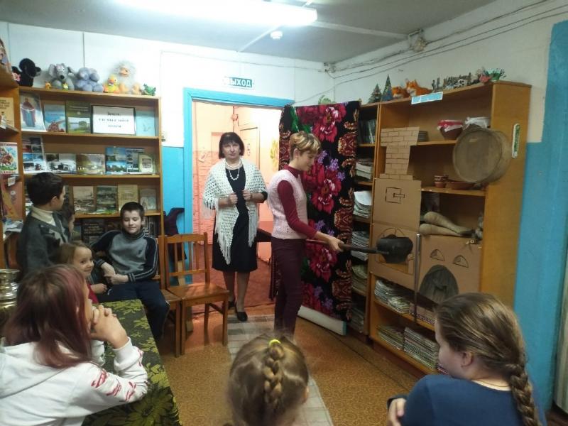Сотрудники библиотеки для этого мероприятия превратили помещение библиотеки в настоящую русскую избу. Тут и русская печь (макет печи изготовлен из картона) с чугунами и ухватом, на полу домотканые половички, у окна накрытый стол.