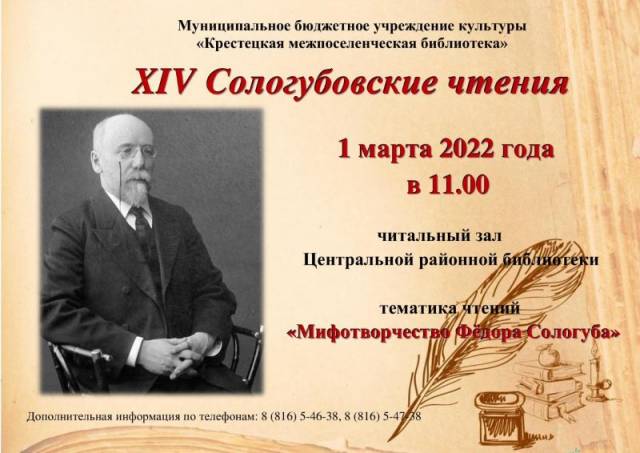 1 марта в Центральной районной библиотеке посёлка Крестцы пройдут традиционные ХIV Сологубовские чтения. В этом году они будут посвящены теме «Мифотворчество Фёдора Сологуба».