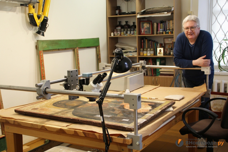 Специалисты мастерской реставрации темперной живописи Новгородского музея-заповедника под руководством Юрия Александрова, художника-реставратора высшей категории, приступили к реставрации двух древних икон с помощью новейшего профессионального оборудования, которое было приобретено при поддержке попечителей музея. В работе у Юрия Александрова – икона «Богоматерь Одигитрия» XIV века из церкви Успения из села Курицко – самая древняя из нераскрытых икон из собрания Новгородского музея-заповедника. На сегодняшний день реставратор очистил от поздних записей и потемневшей олифы фигуру младенца и приступил к раскрытию изображения Богоматери.