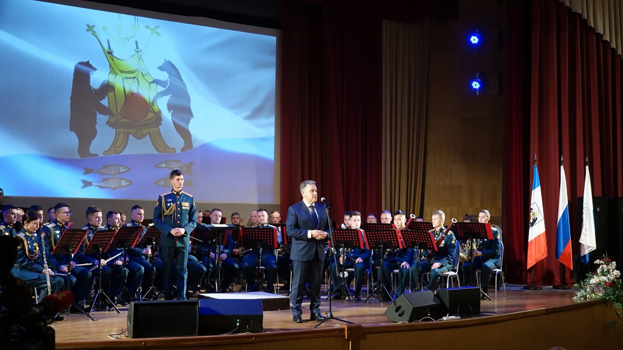 Со сцены концертного зала прозвучало видеопоздравление Почётного гражданина Великого Новгорода и Новгородской области, участника Великой Отечественной войны Александра Попова, в котором он пожелал молодому поколению здоровья, любить свою Родину и всегда быть готовым её защищать.