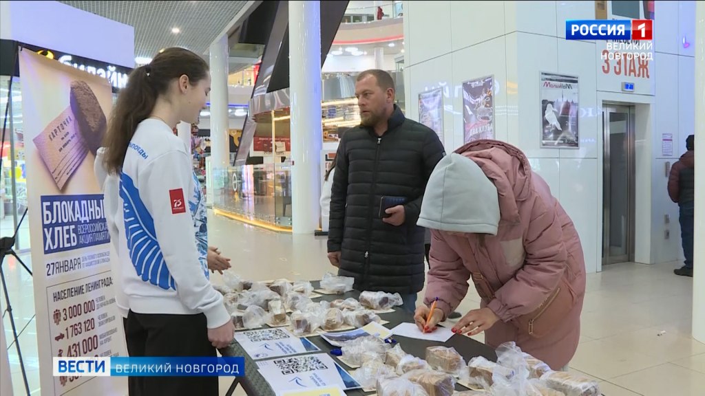 Акция посвящена 79 годовщине снятия блокады Ленинграда. В честь этой даты в торговом центре "Мармелад" волонтёры Российского движения детей и молодёжи раздавали посетителям по 125 граммов чёрного хлеба.