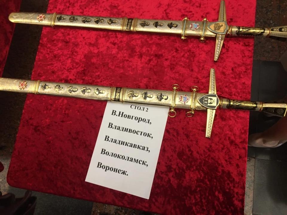 «Это символическая церемония, подчеркивающая заслуги Великого Новгорода, жителей Старой Руссы, тех, кто освобождал эти города, кто был в партизанских отрядах. Она подчеркивает славу наших городов и значение Победы в Великой Отечественной войне», – отметил Андрей Никитин. «Это достойная награда, наша святая обязанность в связи с тем, что сейчас происходит в мире, – чтить и помнить подвиги и передавать это подрастающему поколению», – сказал Владимир Еремин. Великий Новгород на церемонии представляли исполняющий полномочия Мэра Великого Новгорода Владимир Еремин, председатель Новгородской городской общественной организации ветеранов (пенсионеров) войны, труда, Вооруженных Сил и правоохранительных органов Юрий Левков, и.о. председателя местного отделения "Волонтеры Победы" Великого Новгорода Захар Назаренко.Для справки: «Мечи Победы» представляют собой образец авторского художественно украшенного длинноклинкового оружия. Каждый меч покрыт золотом высшей 999,9 пробы. Особую парадность изделиям придает инкрустация полудрагоценными уральскими камнями: гранатом, символизирующим пролитую кровь, и голубым топазом – символом мира. Длина клинков составляет 1,2 метра, а вес – более пяти килограммов. На ножнах изображен орден Победы, годы Великой Отечественной войны и портреты Ильи Муромца, Александра Невского, Петра Первого, А.В. Суворова, П.С. Нахимова, Г.К. Жукова и И.В. Сталина. На одной стороне самого клинка надпись "Городу воинской славы", на другой – изречение Александра Невского: "Кто к нам с мечом придет, тот от меча и погибнет". Кроме того, каждый меч имеет свою уникальную особенность: выгравированный герб того города, в который отправится подарочный экземпляр.