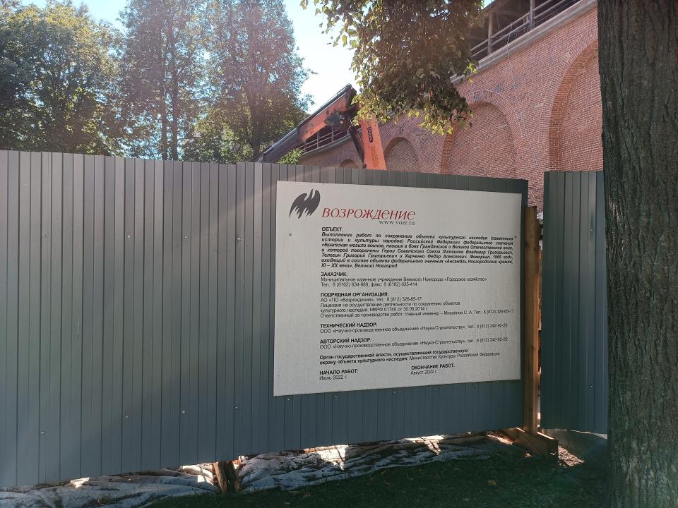 Компания из Санкт-Петербурга АО «Производственное объединение «Возрождение» с 14 июля выполняет ремонт мемориального комплекса «Вечный огонь славы» - братской могилы воинов, павших в боях Гражданской и Великой Отечественной войн, в которой похоронены в том числе, участники освобождения Новгородской земли от фашистов Герои Советского Союза Литвинов Владимир Григорьевич, Телегин Григорий Георгиевич и Харченко Федор Алексеевич. Мемориал 1965 года входит в состав объекта федерального значения «Ансамбль Новгородского Кремля, XI-XX века».