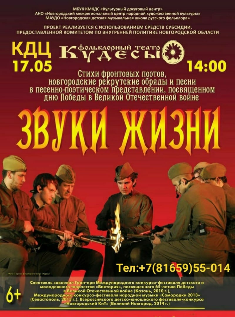 17 мая в 14:00 в Культурном досуговом центре состоится спектакль «Звуки жизни». Спектакль завоевал гран-при международного конкурса-фестиваля детского и молодежного творчества «Виктория», посвященного 65-летию Победы в Великой Отечественной войне, а также является лауреатом первой степени международного конкурса «Народные истоки».