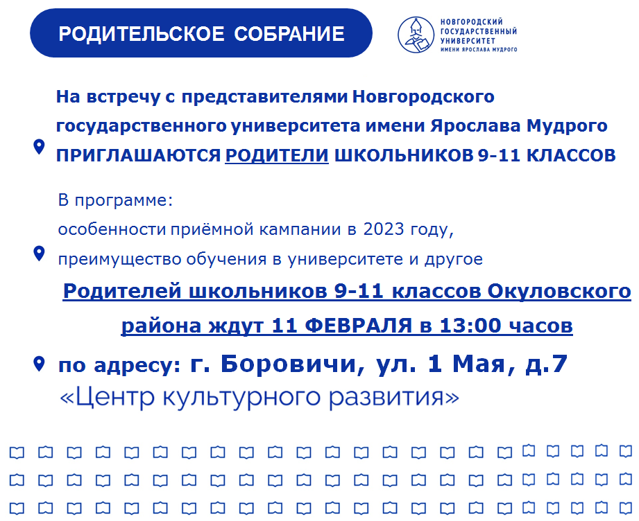 11 февраля (суббота) в 13.00 часов состоится межмуниципальное родительское собрание по адресу: г. Боровичи, ул.1-е Мая, д.7 – «Центр культурного развития».