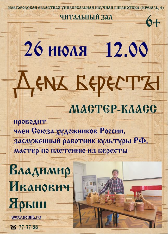 26 июля в 12.00 в Новгородской областной универсальной научной библиотеке (Кремль,4) состоится традиционный мастер-класс, посвящённый Дню Бересты.
