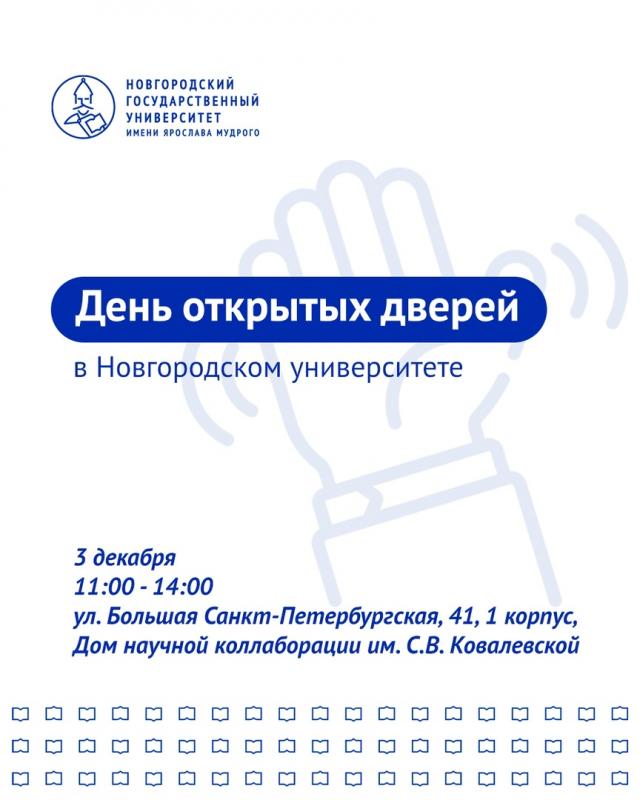 Общеуниверситетский День открытых дверей «Мудрая ТраеКТОриЯ» пройдет в эту субботу - 3 декабря с 11:00 по 14:00 часов - на площадке Дома научной коллаборации им. С.В Ковалевской по адресу: Великий Новгород, ул. Большая Санкт-Петербургская, д. 41, 1 корпус.