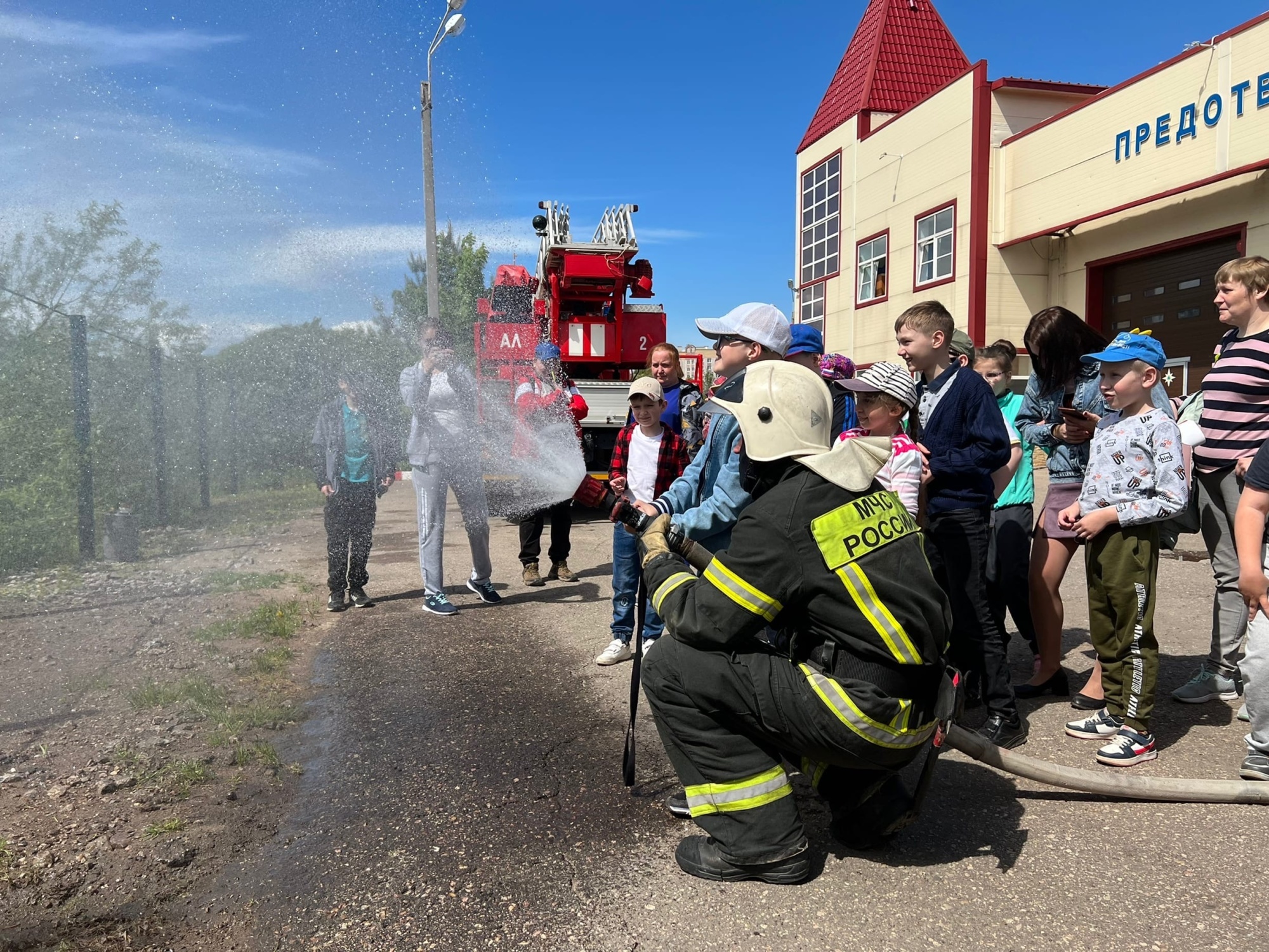 Мальчишки и девчонки с большой гордостью держали в руках пожарный ствол и на какое-то мгновение представляли себя отважными огнеборцами.