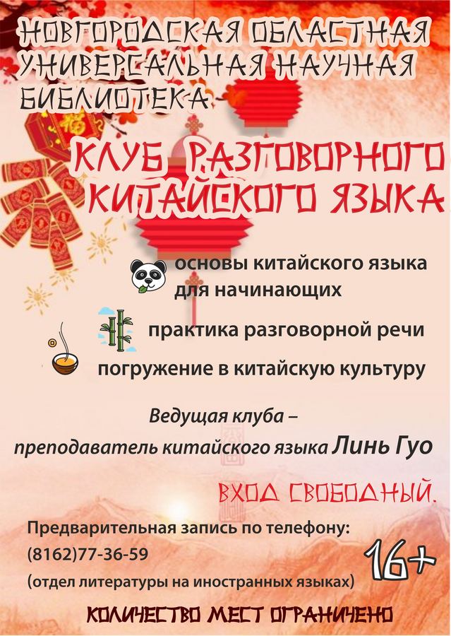 В Новгородской областной библиотеке начинает работу клуб разговорного китайского языка для начинающих (взрослые). Встречи клуба будут проходить каждую неделю по вторникам в 18.30, ведущая клуба – опытный преподаватель китайского языка, выпускница Санкт-Петербургского государственного университета Линь Гуо. Желающие смогут сделать первые шаги в изучении китайского, узнать о культуре Поднебесной и пообщаться с носителем языка.