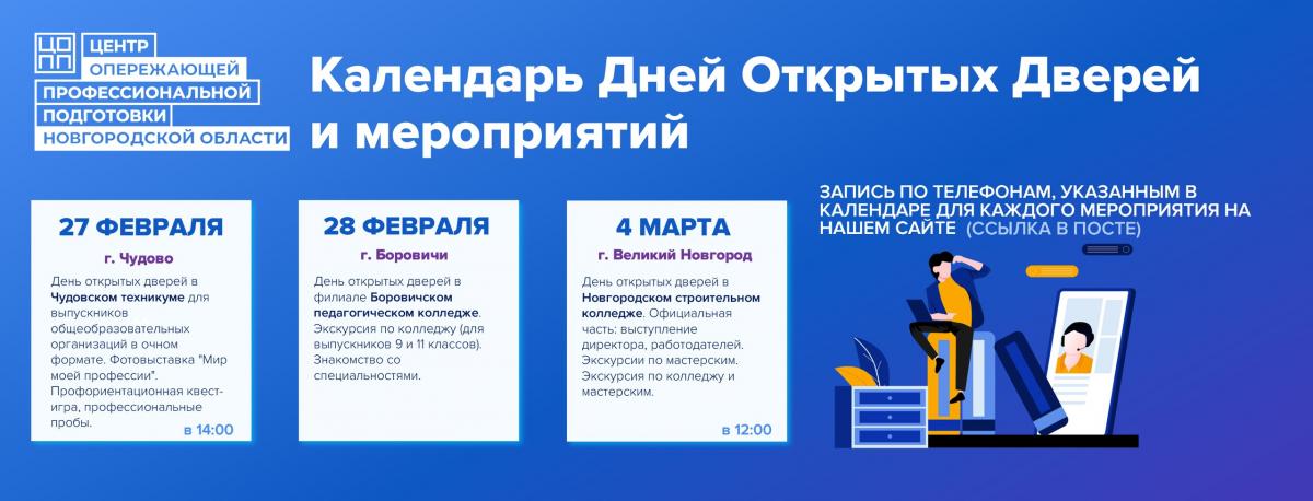 Колледжи и техникумы Новгородской области продолжают открывать свои двери будущим абитуриентам и их родителям. Подробнее о проведении мероприятий узнавайте в нашем календаре на сайте: https://copp53.ru/calendar/