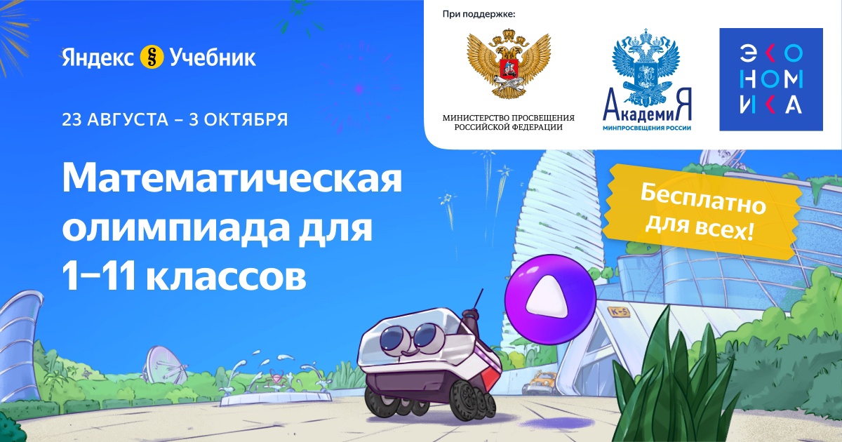 Технологическая образовательная платформа Яндекс Учебник приглашает учеников 1–11 классов принять участие в бесплатной Математической олимпиаде до 3 октября на сайте https://education.yandex.ru/olymp/