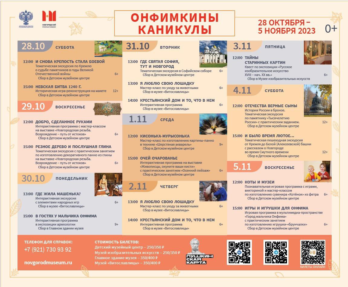 – в Детском музейном центре (Кремль, Судейский городок, 3) в мультимедиапространстве «Город мальчика Онфима» можно узнать о жизни в средневековом Новгороде и одном из его жителей – мальчике Онфиме; увлеченным историей предложат принять участие в игре-реконструкции на макете «Ледовое побоище 1242 г.»; на мастер-классах ребята изготовят сувениры из глины, валяной шерсти и фетра; на пешеходных экскурсиях по Кремлю школьники побывают в Софийском соборе - древнейшем православном храме России, услышат историю создания памятника Тысячелетию России, узнают о трагической судьбе новгородских шедевров в годы Великой Отечественной войны;
