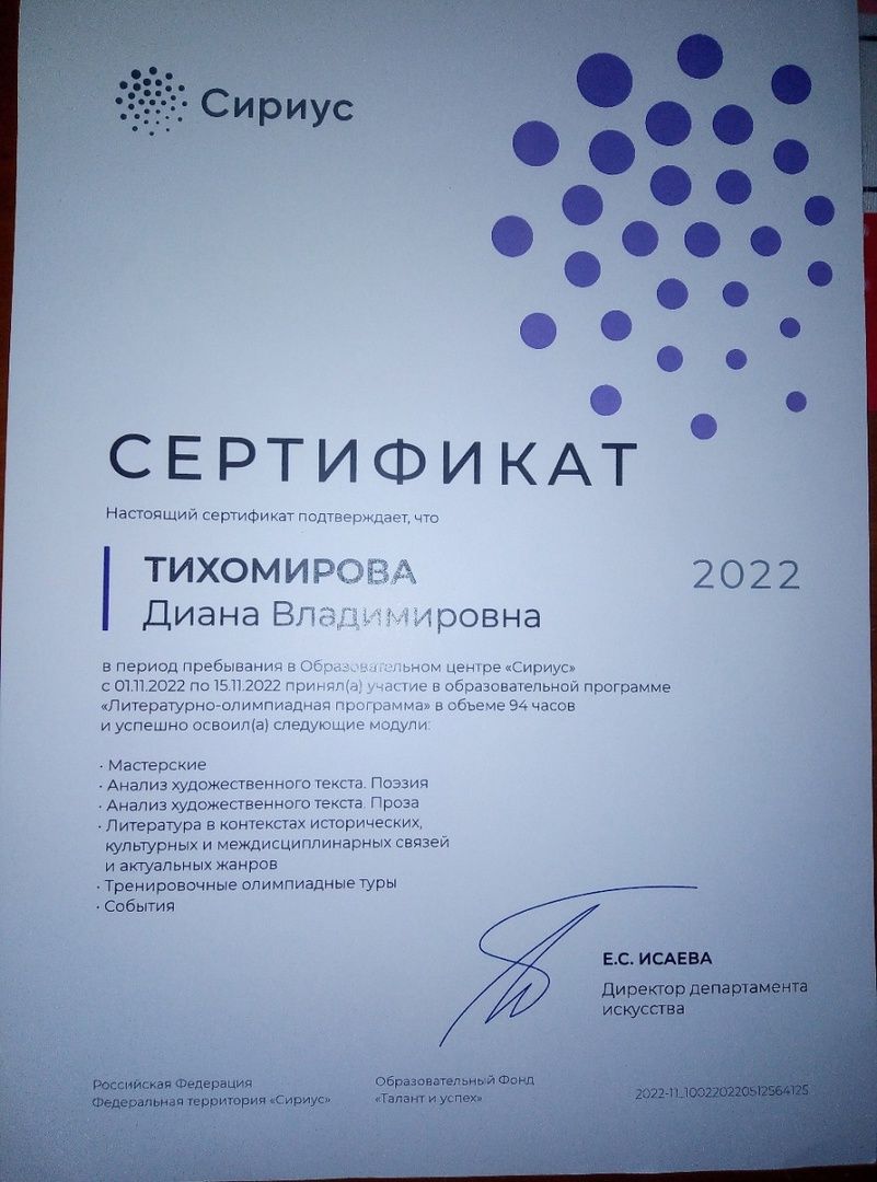 Диана успешно освоила программу литературно-олимпиадной смены, за что была награждена сертификатом. Она выражает огромную благодарность Сириусу за возможность пройти качественное обучение и насладиться насыщенной жизнью возле моря.