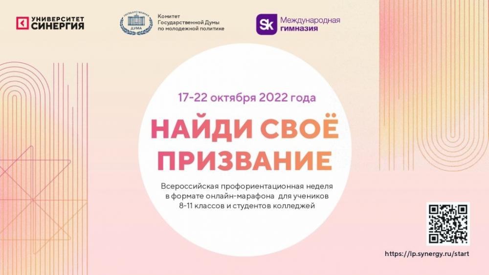 С 17 по 22 октября Университет «Синергия» при поддержке Комитета Государственной Думы по молодежной политике и Общеобразовательного частного учреждения Международной гимназии инновационного центра «Сколково» проводит для школьников 8-11 классов и студентов колледжей Всероссийскую профориентационную неделю «Найди своё призвание!».