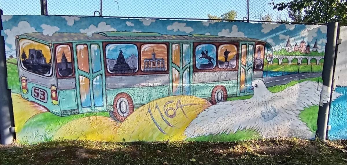 В Великом Новгороде на бетонном заборе «Автобусного парка» появились два мурала, созданные созданные выпускниками художественной школы. К их нанесению приступили после того, как в апреле директор предприятия Владимир Ерёмин выступил с предложением уличным художникам принять участие в росписи ограждения.