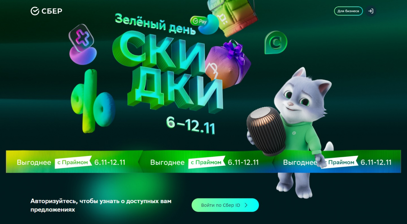 Компании-партнёры Сбера подготовили для клиентов сюрпризы и специальные предложения в Зелёный день , который в этом году пройдёт с 9 по 12 ноября. А для владельцев подписки СберПрайм и СберПрайм+ акция начнется ещё раньше — 6 ноября. Из года в год Сбер и его партнёры делают уникальные и выгодные предложения всем жителям России, помогая решать повседневные задачи, экономить деньги и время.