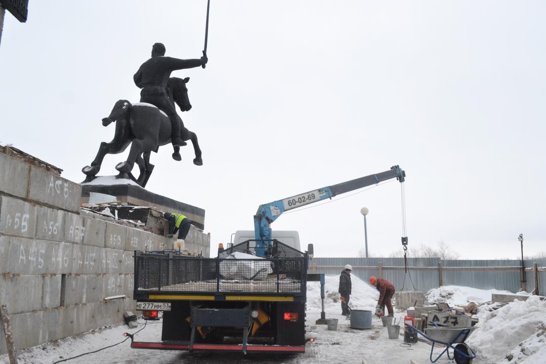 © Пресс-центр администрации Великого НовгородаСейчас на монумент устанавливают гранитные блоки облицовки стилобата. Внутри проводятся работы по вычинке, то есть по реконструкции кирпичной кладки первого этажа и подвальных помещений.