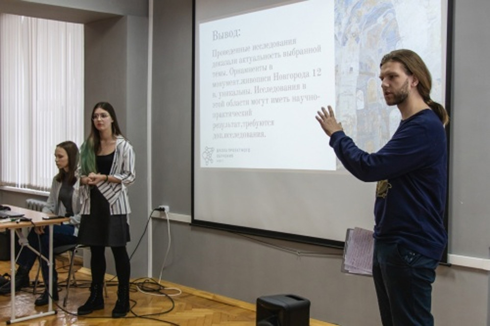 Презентация проекта «Орнаменты монументальной живописи Великого Новгорода». Фото НовГУ.Эксперты признали проектом с лучшей научной составляющей работу студентов пединститута «Орнаменты монументальной живописи Великого Новгорода». В ходе работы, студенты изучили орнаменты на памятниках XI-XII веков. По словам третьекурсника Даниила Аверьянова, одного из авторов работы, информации об орнаментах оказалось очень мало, так как источники о живописи того периода в основном рассказывают про образы святых.