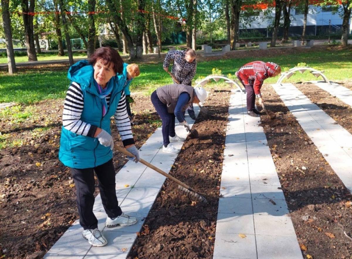 Жители посёлка Крестцы посадили многолетние цветы в Екатерининском сквере