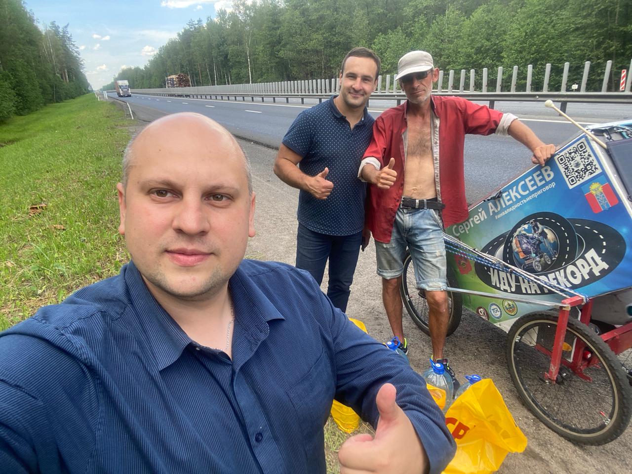 Сегодня, Депутаты Думы Великого Новгорода Сергей Шруб и Николай Швабович, встретились на трассе в 30 км от Великого Новгорода с путешественником, 42-летним Сергеем Алексеевым из Краснодарского края.