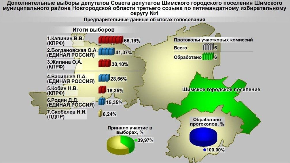 © t.me/ikno53На дополнительных выборах депутатов Совета депутатов Шимского городского поселения третьего созыва по пятимандатному избирательному округу №1 победил Василий Калинин от партии КПРФ с 66,19% голосов. Следом за ним — Ольга Богдановская от «Единой России» с 41,37% голосов.