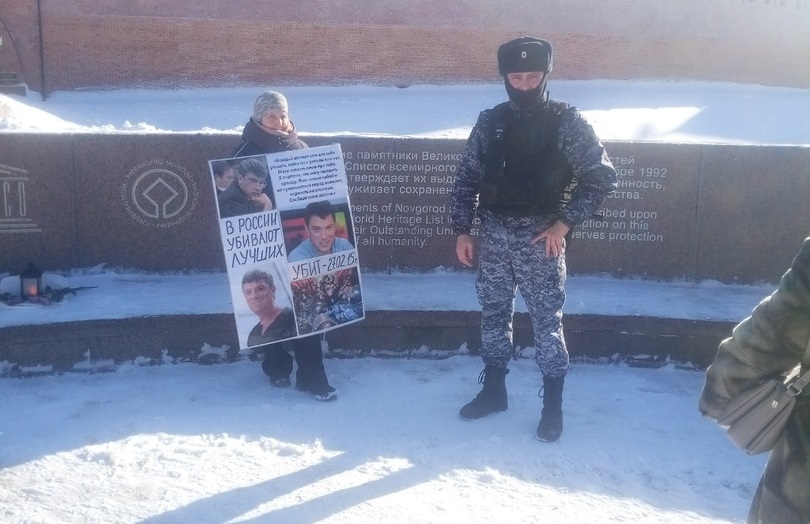 В Великом Новгороде у входа в Кремль женщина вышла на одиночный пикет в память об убийстве политика Бориса Немцова.