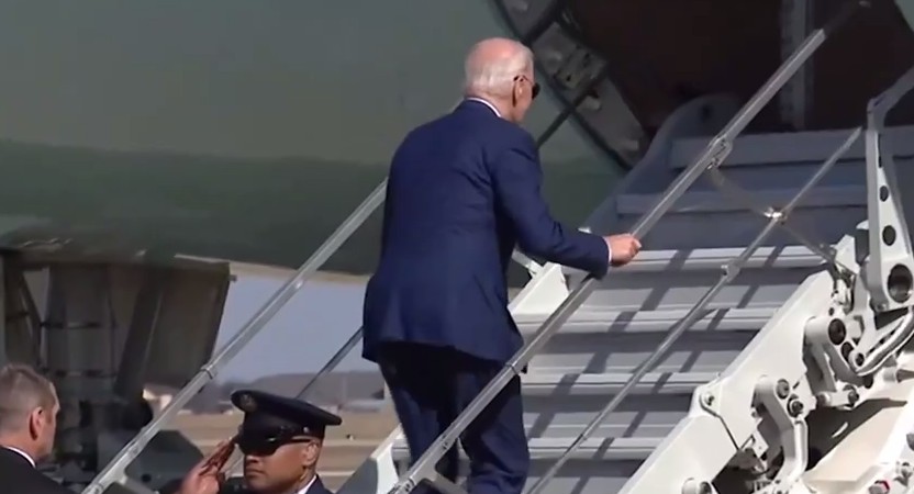 Президент США Джо Байден продолжает попадать в различные неловкие ситуации. Например, недавно он вновь дважды споткнулся, поднимаясь по трапу своего самолёта.