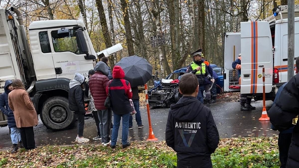 Легковой автомобиль получил серьёзные повреждения. На месте работают спасатели и другие службы. Данные о пострадавших уточняются.