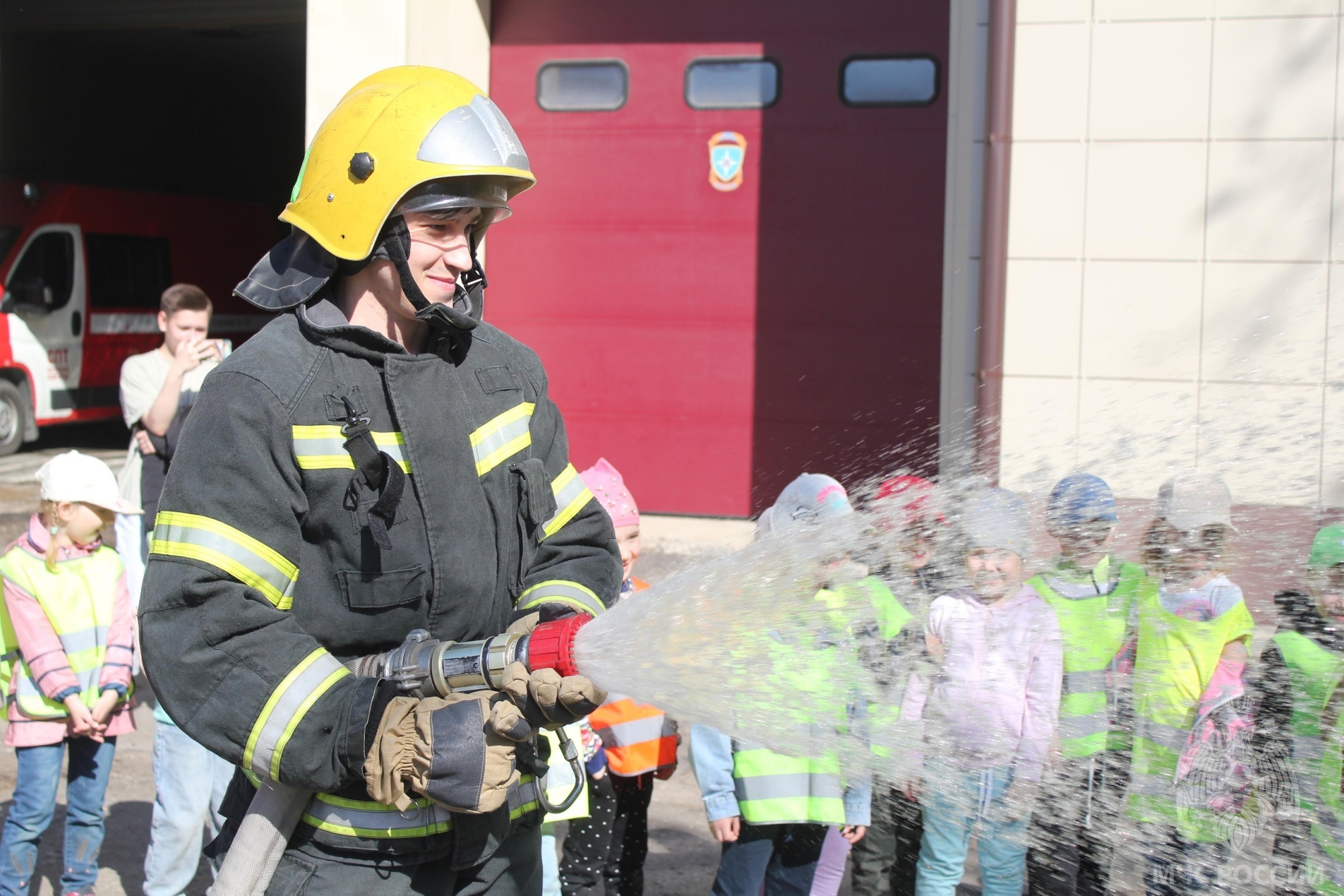 Любознательные малыши с удовольствием примеряли на себе экипировку пожарного, изучали технику и даже побывали в кабинах пожарных автомобилей, стоящих на боевом дежурстве.
