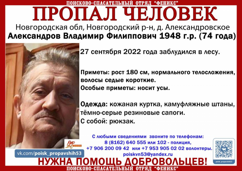 По информации поисковиков, он был одет в кожаную куртку, камуфляжные штаны, тёмно-серые резиновые сапоги. Пенсионер ростом примерно 180 см, нормального телосложения, седые короткие волосы, носит усы. У мужчины был с собой рюкзак.