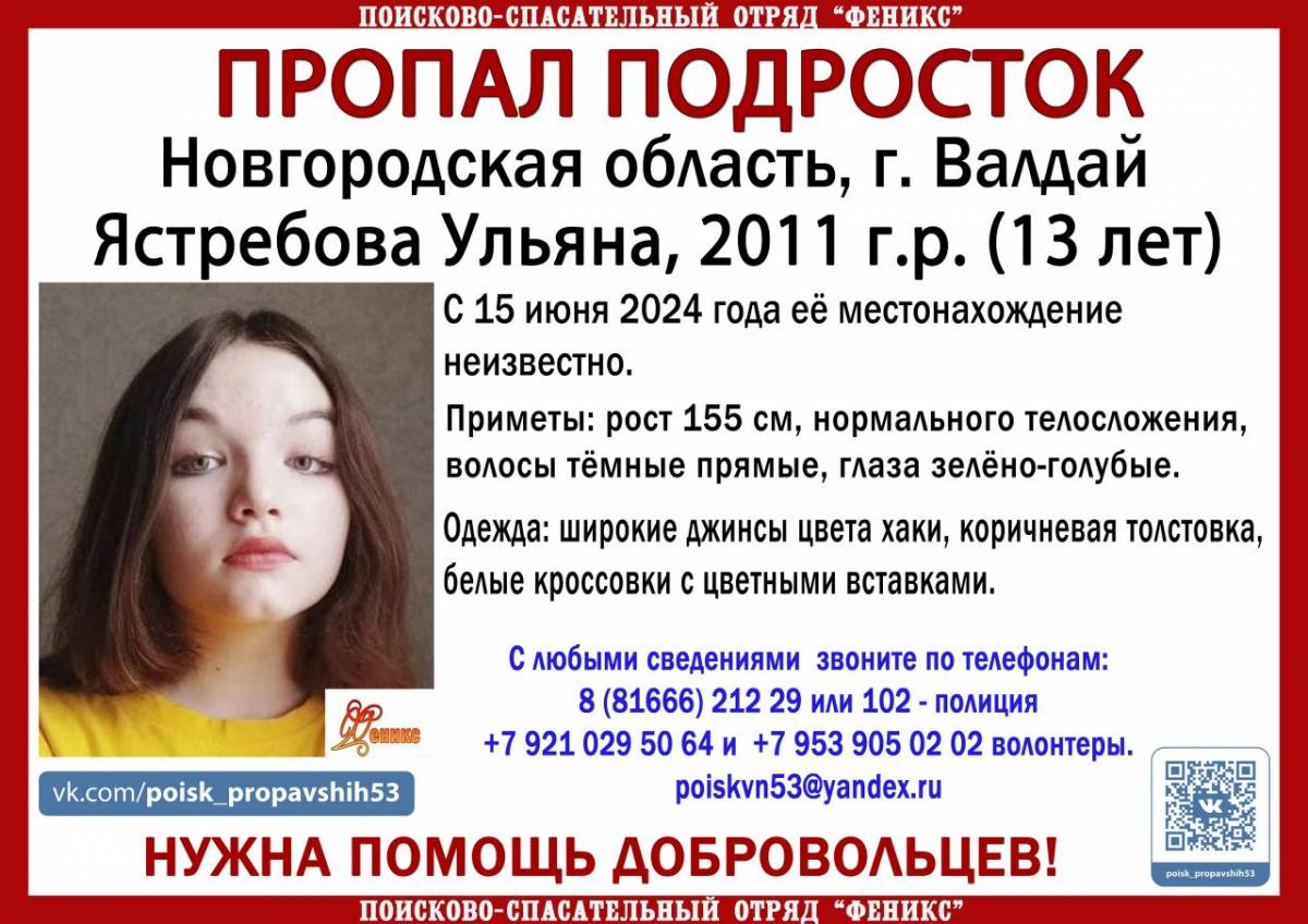 Вчера, 15 июня, в Валдае пропала 13-летняя Ульяна Ястребова. О её поиске сообщили в поисково-спасательном отряде «Феникс-Боровичи».
