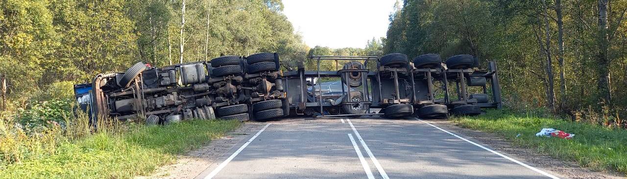 © УГИБДД УМВД России по Новгородской областиВ 15:15 в Старорусском районе на 88 км дороги Демянск — Старая Русса — Сольцы 48-летний водитель грузовика Scania с полуприцепом не выбрал безопасную скорость, не справился с управлением и опрокинулся на проезжей части. В результате ДТП пострадал водитель и его 57-летняя пассажирка, которые получили черепно-мозговые травмы. Бригада скорой помощи доставила их в Старорусскую ЦРБ.