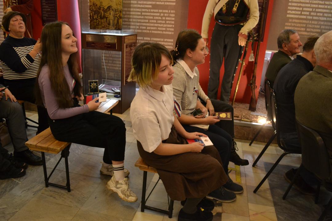 Мэр Великого Новгорода Александр Розбаум и председатель Думы Великого Новгорода Алексей Митюнов вручили юным новгородцам, достигшим 14-летнего возраста, и гражданам Херсонской и Запоржской областей, Луганской и Донецкой Народных Республик Российской Федерации паспорта граждан Российской Федерации. Солисты образцового художественного коллектива "Вокальная студия "Акварель" и вокальной студии "Микст" Дворца культуры и молодёжи "ГОРОД" исполнили для собравшихся вокальные патриотические номера.