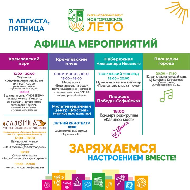 Афиша уличного фестиваля «Новгородское лето» с 11 по 13 августа
