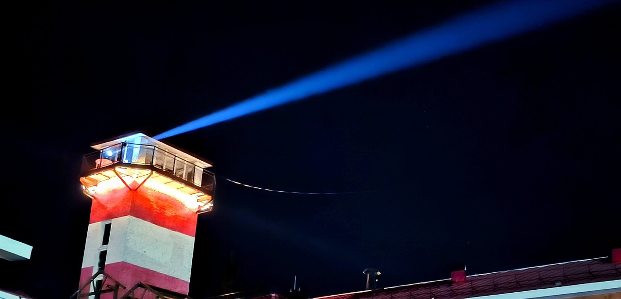 С отремонтированного 28-метрового здания запустили мощный голубой луч в ходе тестов специально приобретённого прожектора. Сообщается, что возможности нового оборудования маяка позволит создавать даже калейдоскопные картинки.