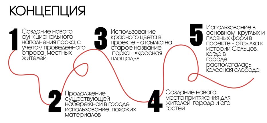 Формирование дизайн-концепции парка включает в себя: создание многофункционального зонирования по периметру всей парковой зоны, с учетом результатов проведенного опроса среди местных жителей; сохранение существующего озеленения, которое является ключевым фактором городского микроклимата; использование отделочных материалов, не только соответствующих экологическим требованиям, но и являющихся продолжением набережной 7 Ноября, которая реализуется в данный момент времени; создание колористического решения парковой зоны с учётом исторического прозвища «Красная площадь»; создание нового места притяжения для жителей города и его гостей; использование круглых форм, что является отсылкой к колёсной слободе, а также внедрение плавных форм повторяющих внешних облик ручья.