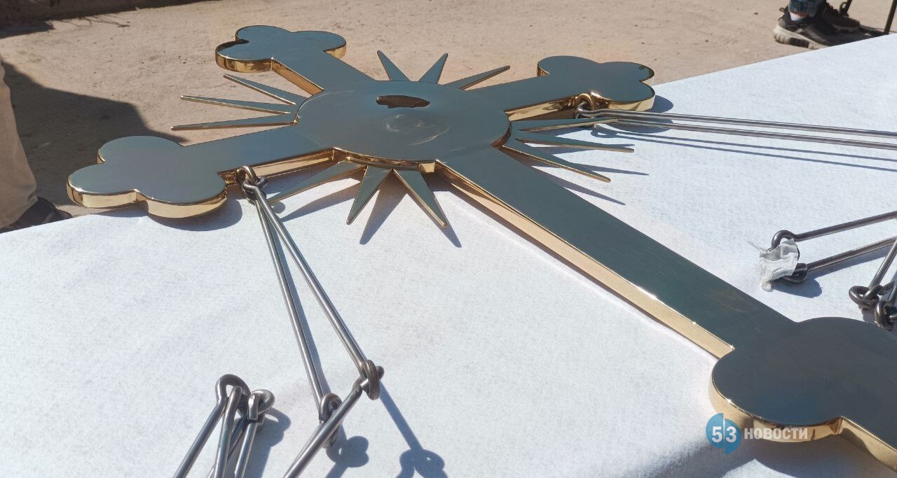 Владыка Лев освятил кресты и один из них водрузили на купол колокольни Никольского собора .