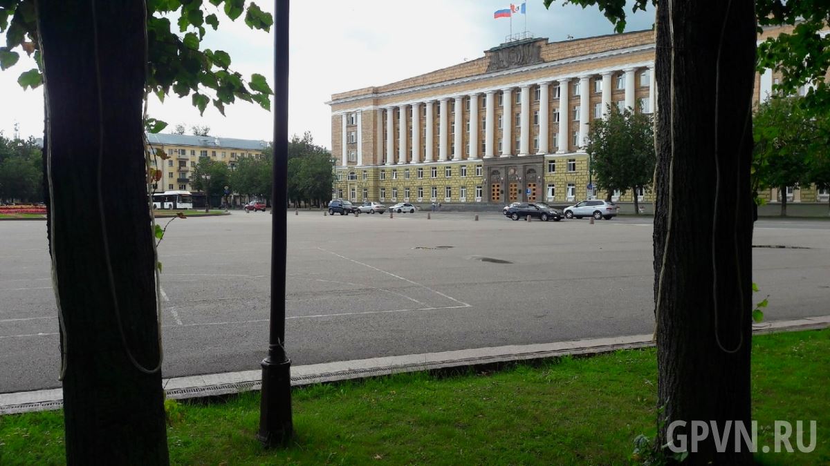 Площадка перед зданием правительства Новгородской области на площади Победы-Софийской оказалась пустой. Сегодня здесь стояли только два патрульных автомобиля.