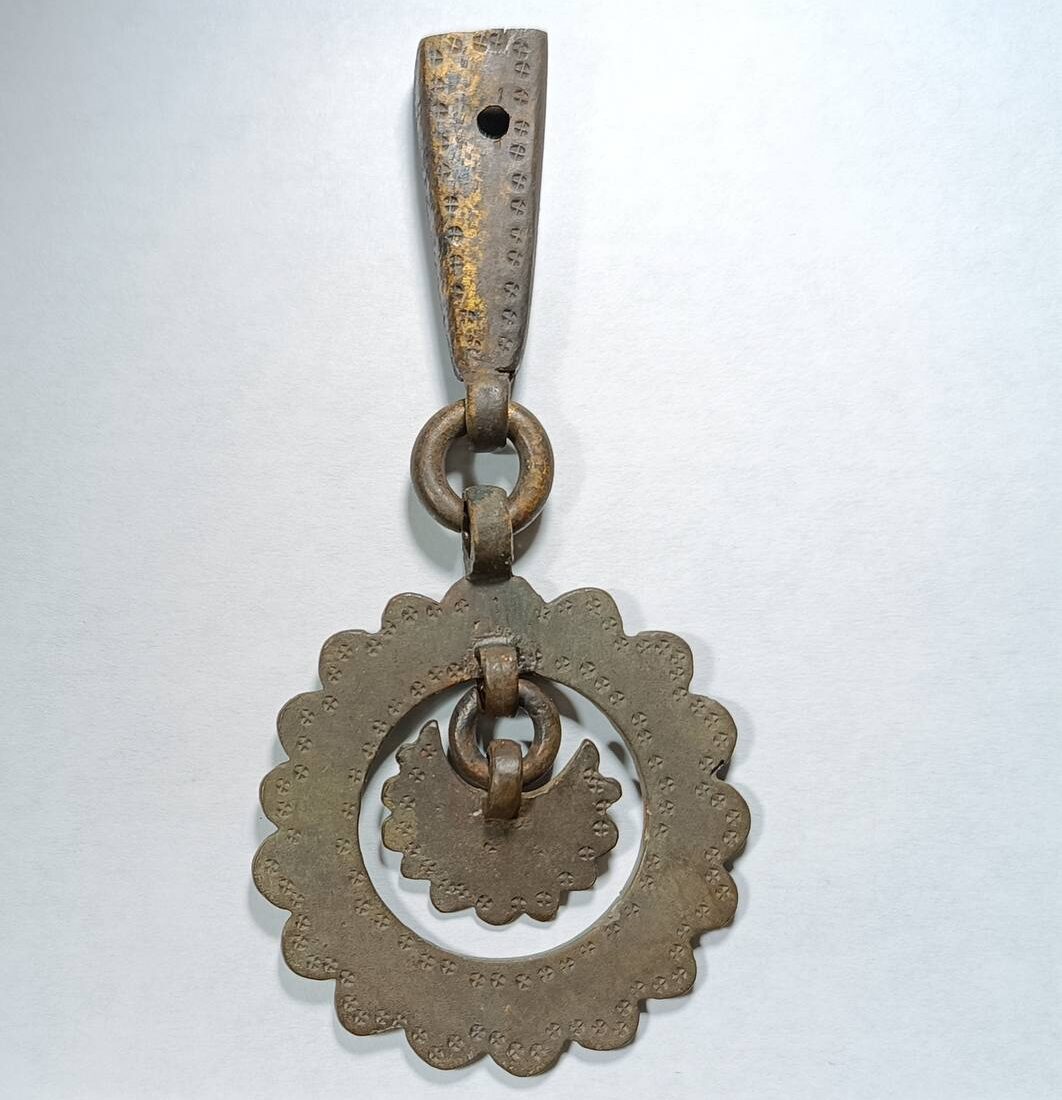 Один из них – орнаментированная привеска, являвшаяся, по-видимому, частью конской сбруи. Она представляет собой фигурное кольцо, внутри которого помещен подвижный элемент в виде многолепесткового цветка. Декоративные элементы соединены с крепежной частью колечком, с одной стороны сохранились следы, предположительно, золочения.