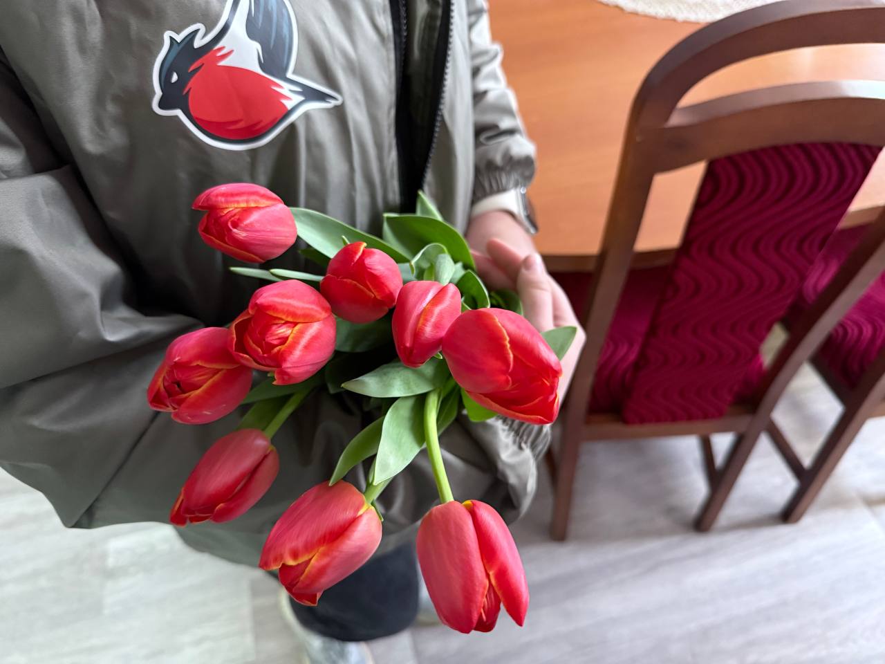 Букеты тюльпанов вручили и волонтёрам, которые ежедневно помогают новгородским бойцам на передовой. Речь идёт о сообществах «Золотые руки ангела», «Готовим для СВОих» и многих других.