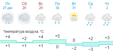 В воскресенье, 29 декабря, синоптики обещают плюс 4 градуса, пасмурную погоду и небольшой снег с дождём.