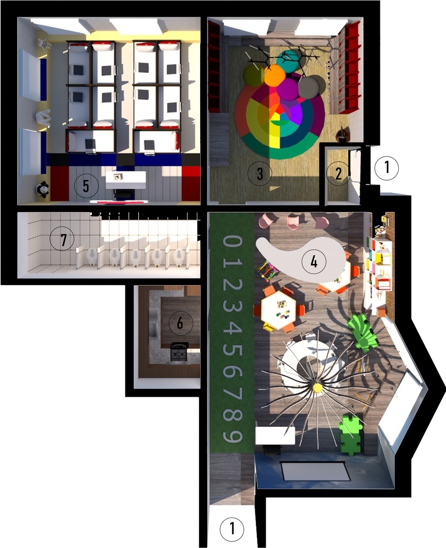 Студентка второго курса магистратуры кафедры дизайна НовГУ Мария Донкина предложила концепцию дошкольного пространства группы №1 детского сада №26 для детей с ограниченными возможностями здоровья (ОВЗ).
