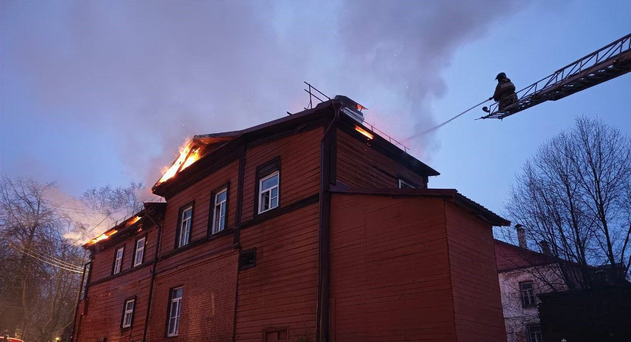 Спасатели МЧС России тушат пожар в Доме генерала Никушкина в Боровичах. На объекте культурного наследия федерального значения загорелась крыша. Дом двухэтажный, построен в XIX веке.